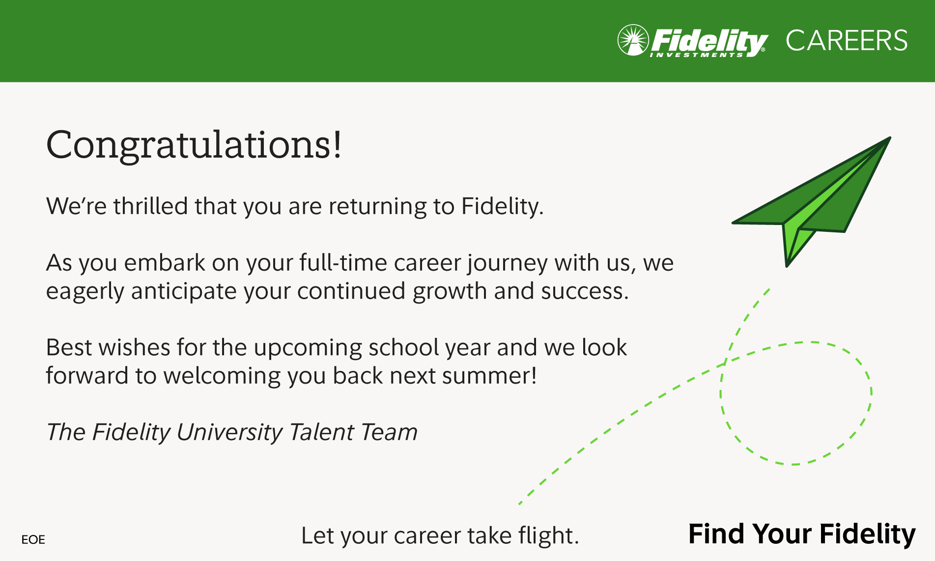 Our intern marketing and collateral is Fidelity branded, but with a spin—creating a sense of community with one another and also a sense of belonging at the company.